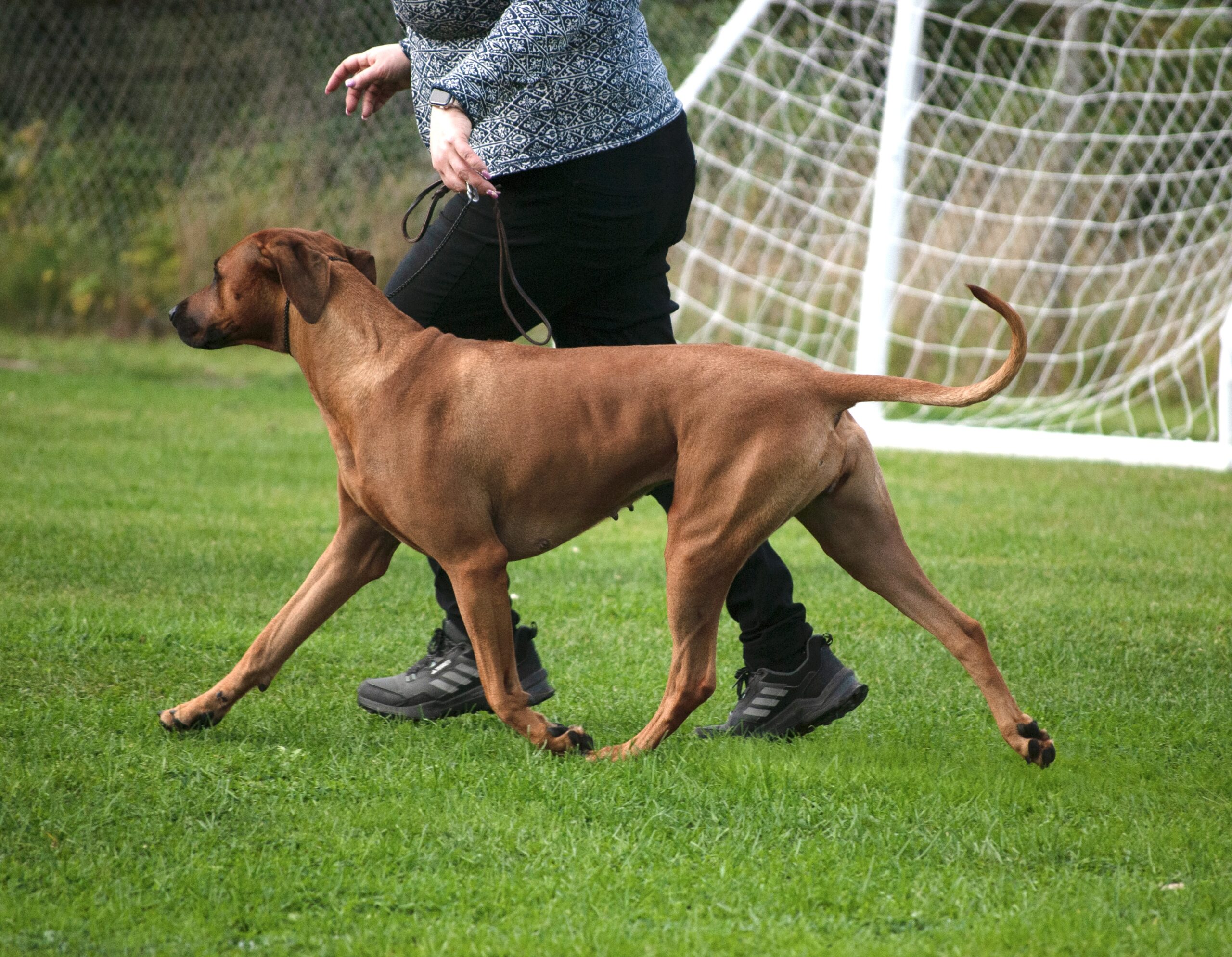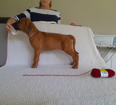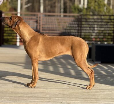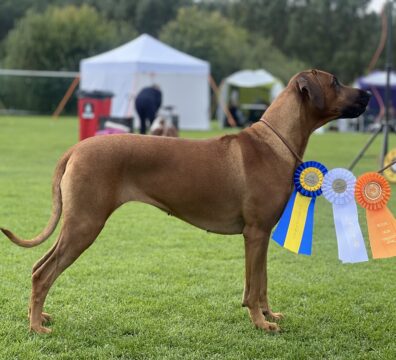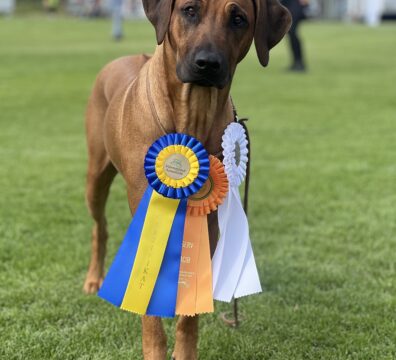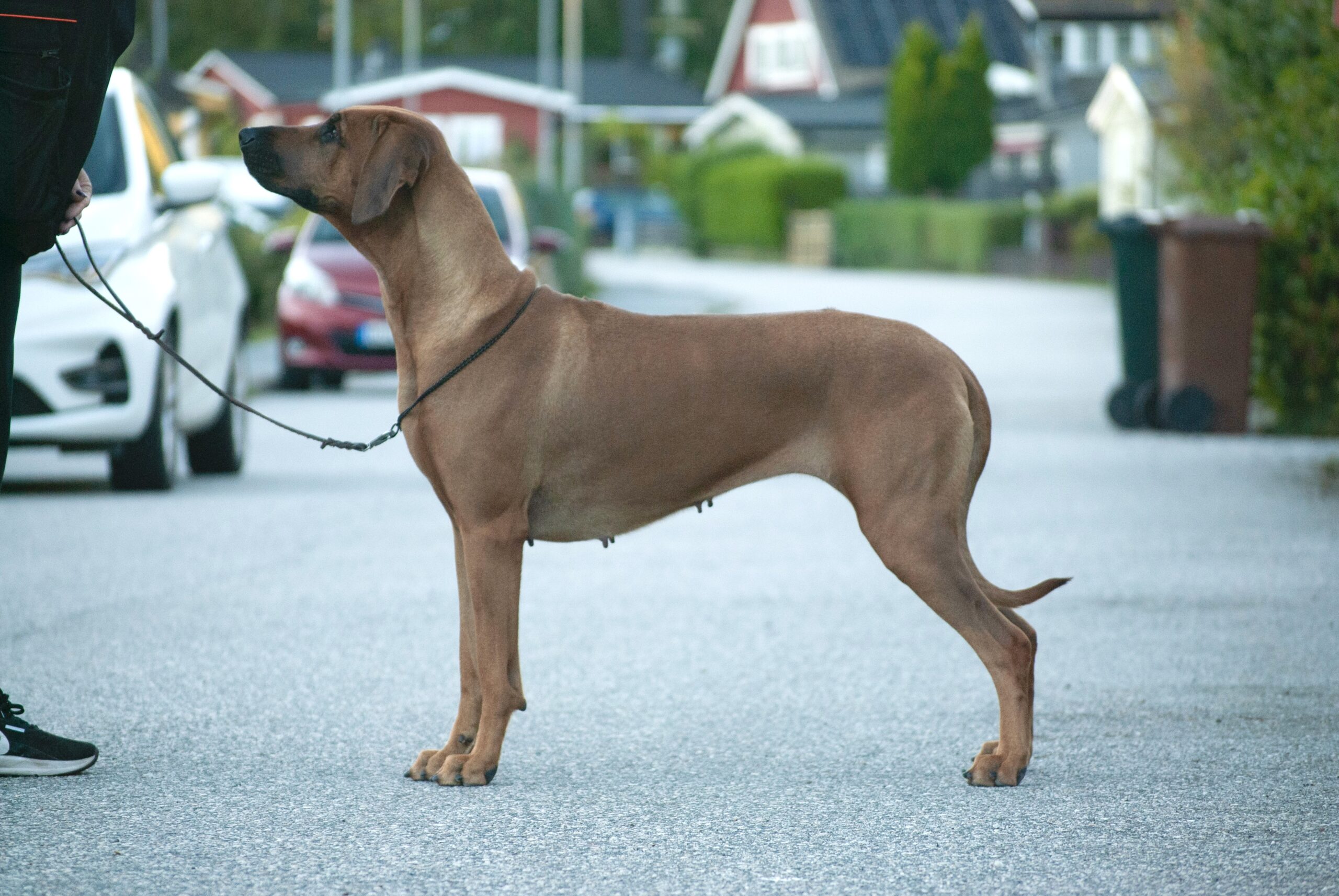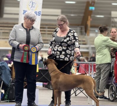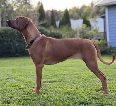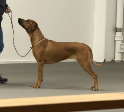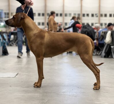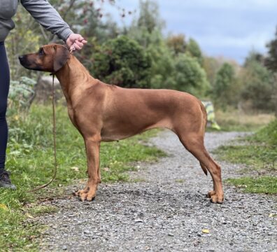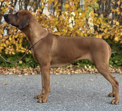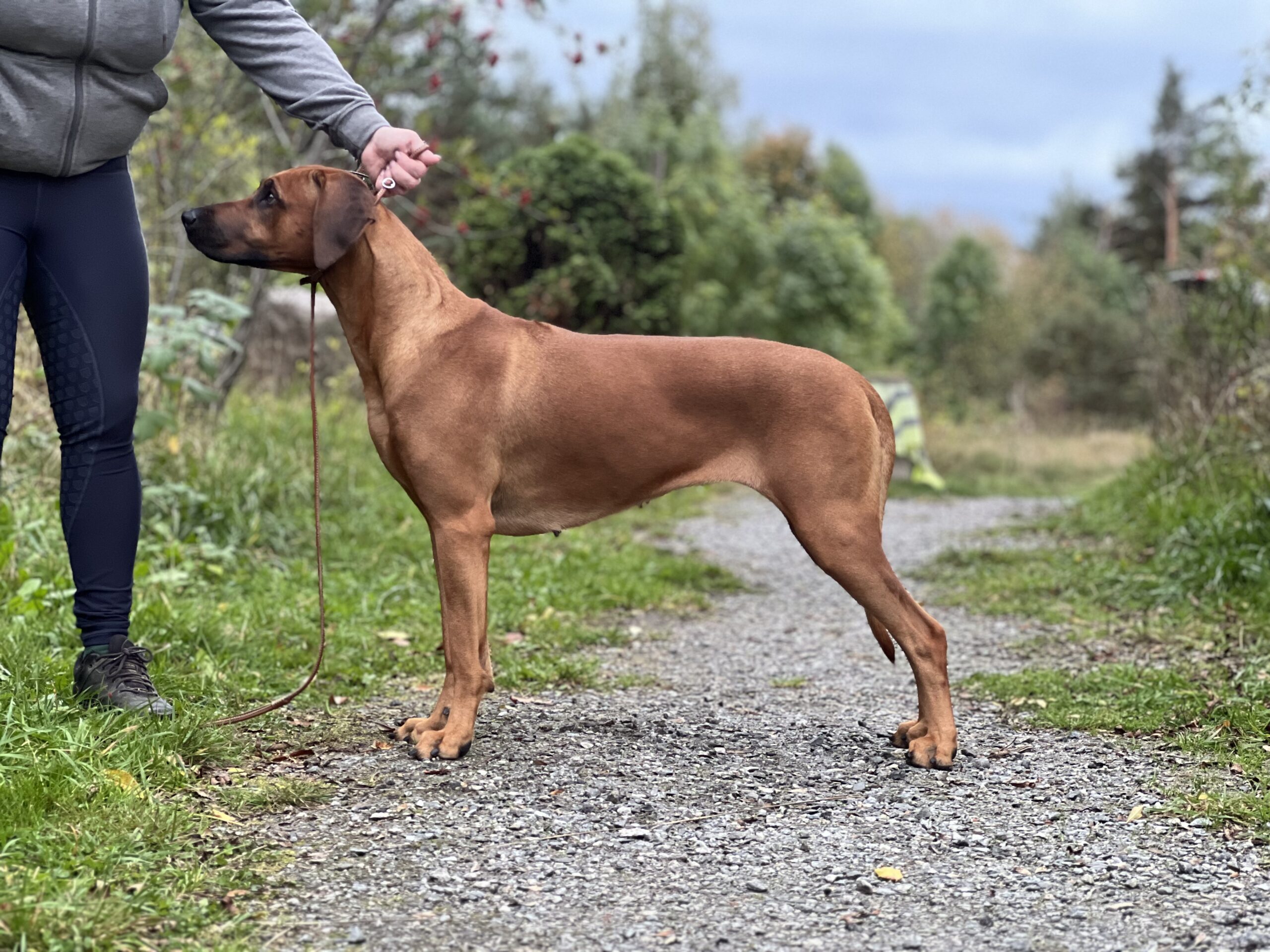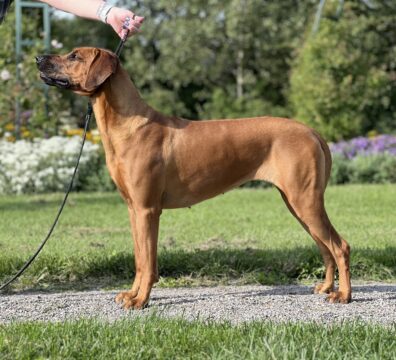 From the beginning Hedda has shown us what a remarkable girl she is. She loves attention,cuddling, people in general and other animals. She gets along very well with both our other dogs and our two cats. She is sweet and very brave – not afraid of anything. Very easy to bring along and handle in every environment. Like most young ridgebacks she is always hungry, still quite intensive and also very interested in game and hunting. Besides of showing, which she has proven to excel at, we have also introduced her to game tracking and agility. Both which she loves and is very good at.
