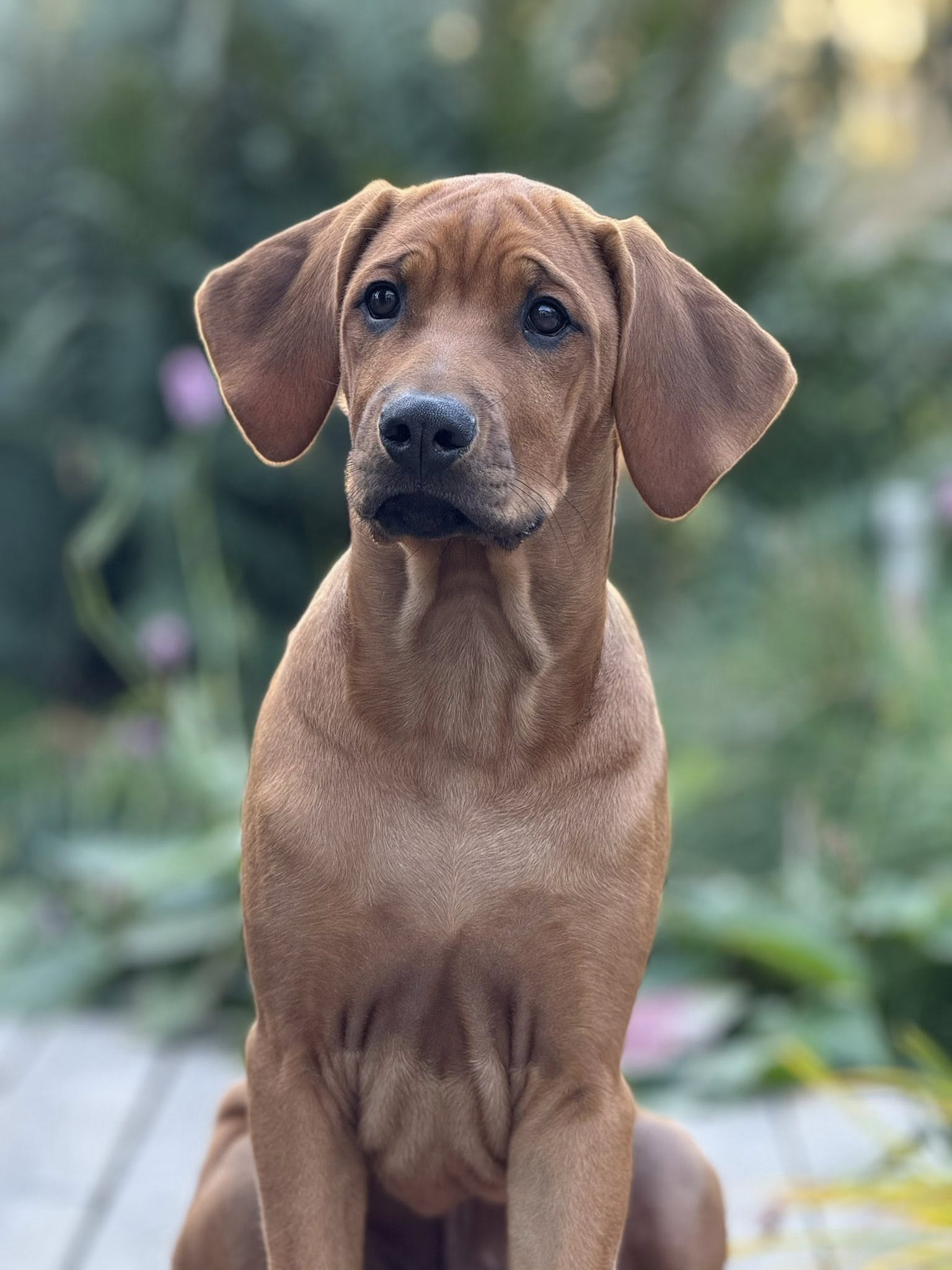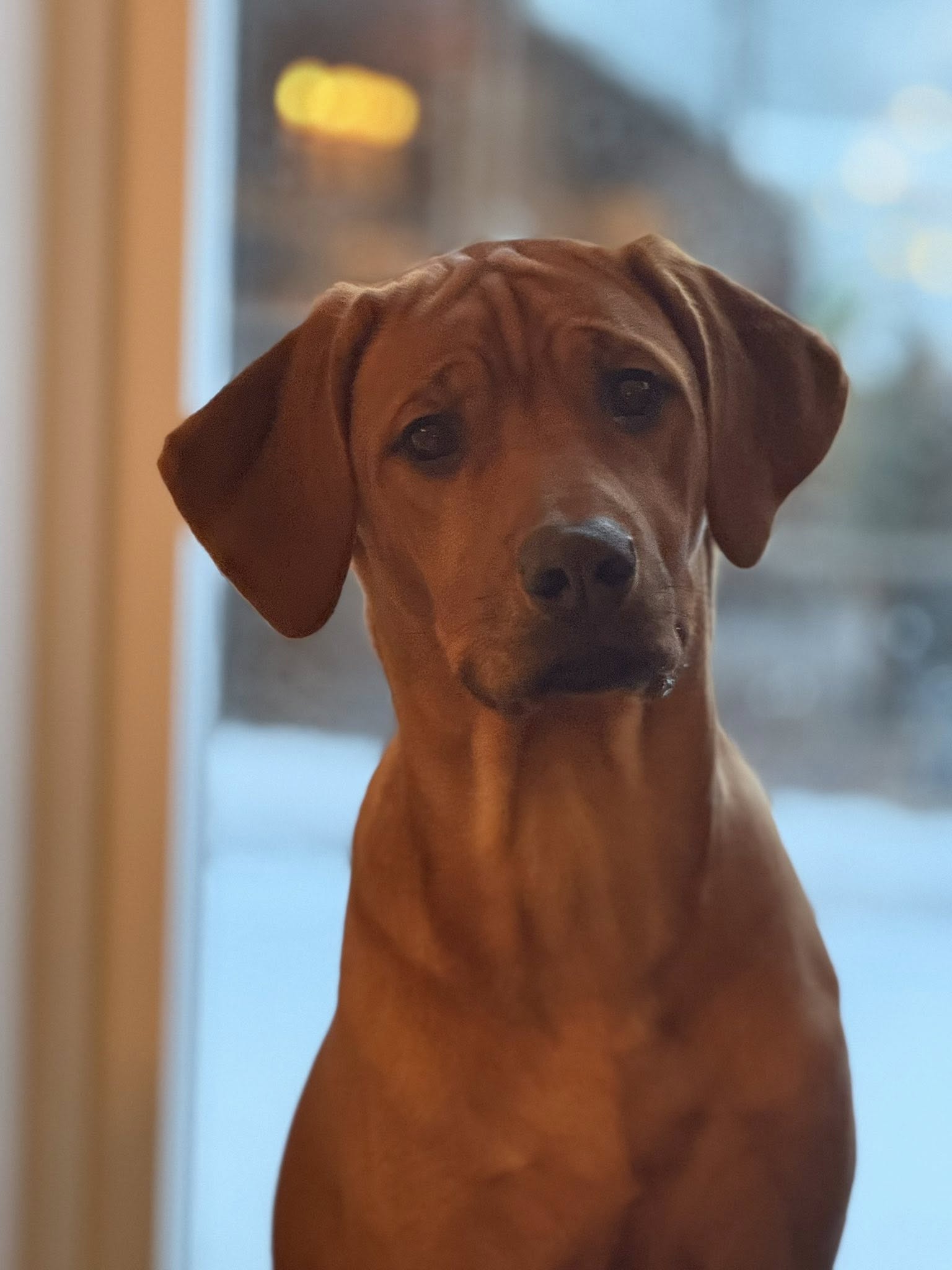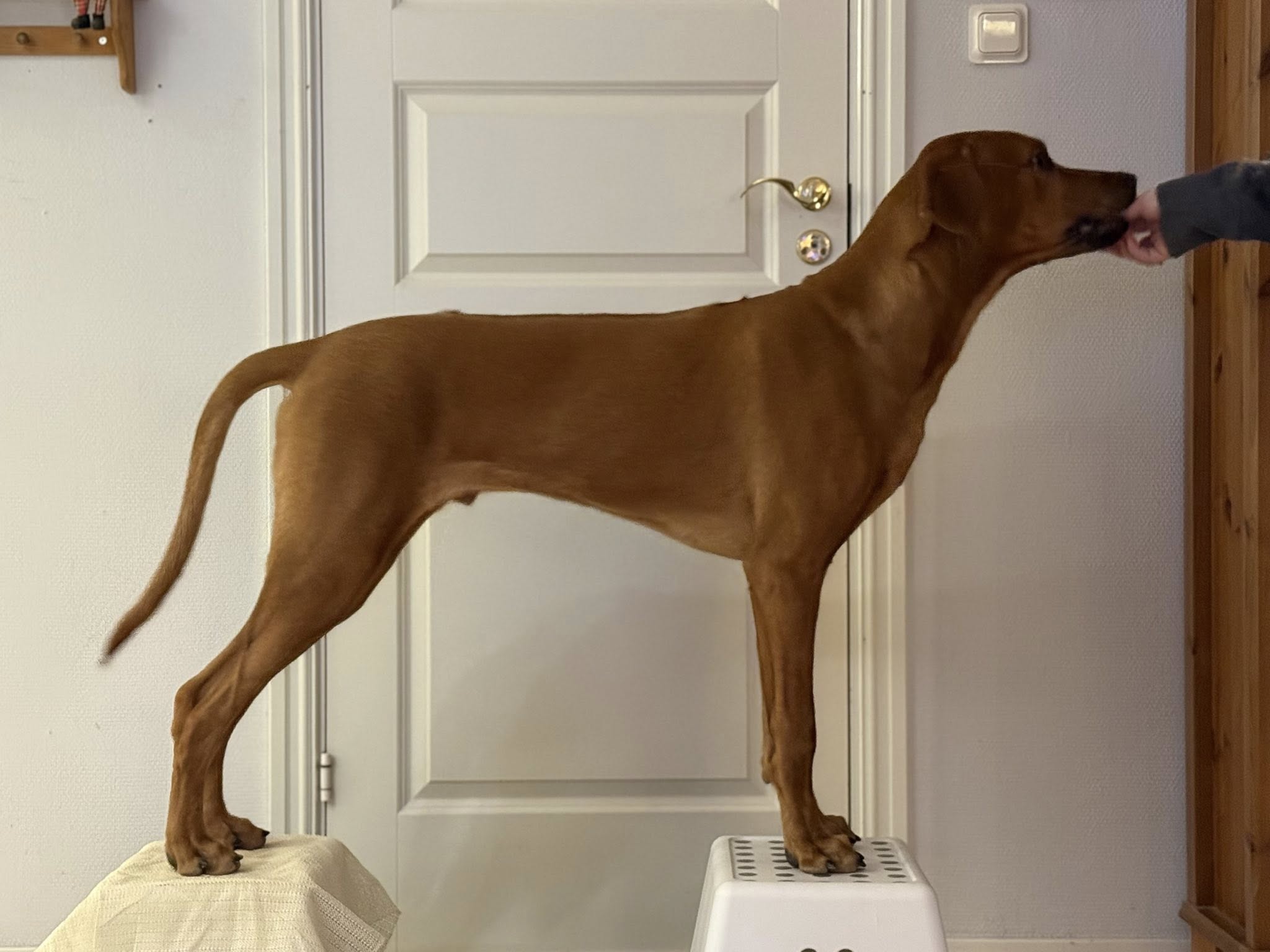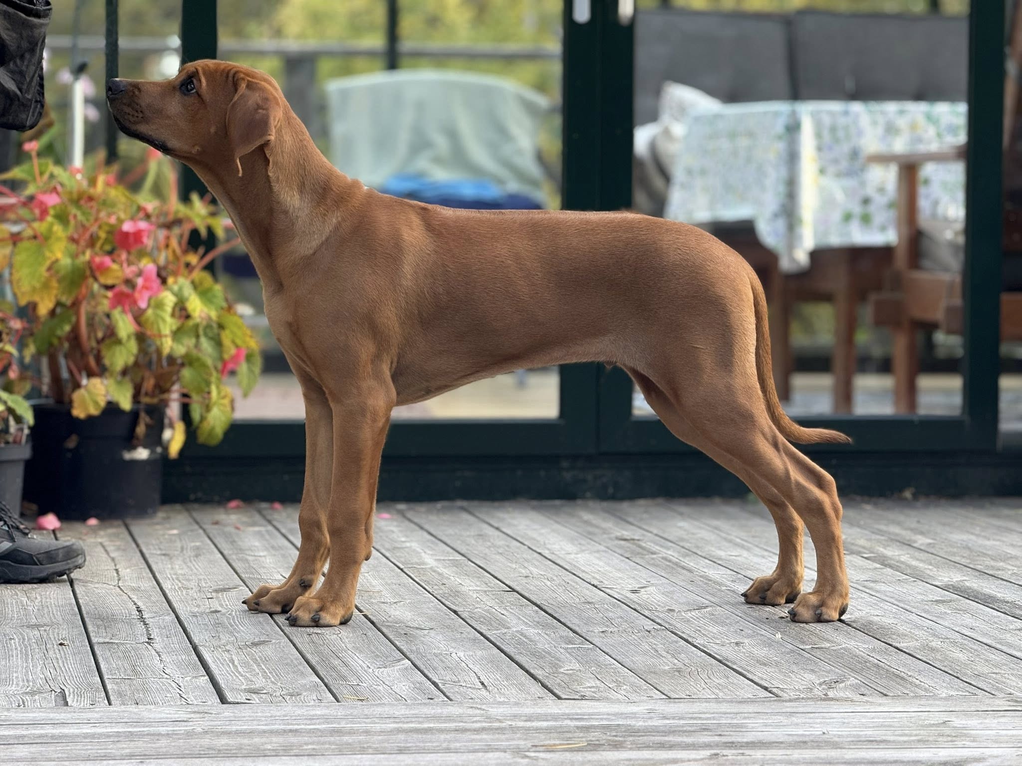“From the beginning Hedda has shown us what a remarkable girl she is. She loves attention,cuddling, people in general and other animals. She gets along very well with both our other dogs and our two cats. She is sweet and very brave – not afraid of anything. Very easy to bring along and handle in every environment. Like most young ridgebacks she is always hungry, still quite intensive and also very interested in game and hunting. Besides of showing, which she has proven to excel at, we have also introduced her to game tracking and agility. Both which she loves and is very good at. Healthwise Hedda has been completely sound her whole life. No problems with allergies and no sensitive stomach.”